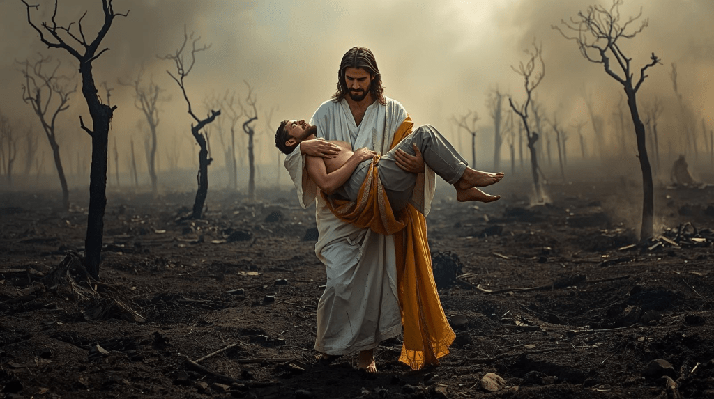 Years ago, my husband Jason was going through a very challenging time in his job. It felt like he was in a great battle having to deal with one thing after another and the onslaught didn’t seem to let up. As I was praying for him one night God gave me a vision of what looked like a battlefield. The ground was charred, embers still smoldering from bombs going off and silhouettes of barren and broken trees in the background. Across the middle of the battlefield came Jesus in a perfectly clean white robe a stark contrast to the dismal battlefield, carrying Jason as he hung limp in his arms. Alive, but exhausted from battle. And at that moment I heard, “Be still and know that I am God; I will be exalted among the nations, I will be exalted in the earth.” (Psalm 46:10 NIV)